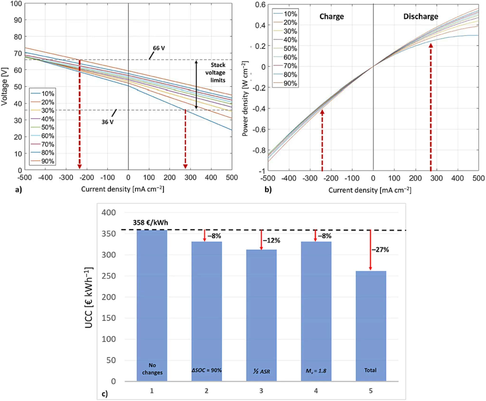 The assessment was performed considering a lifespan of 20 years with a charge/discharge cycle per day. Each component affecting the capital and operative costs was analyzed, and the impact of side phenomena on capacity losses was considered.
