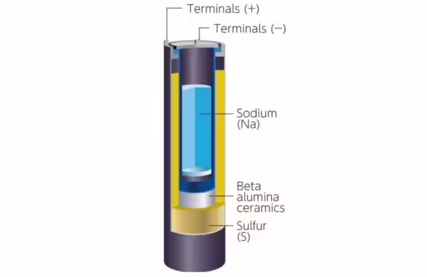 The BASF NaS battery consists of sodium, as the negative electrode, and sulfur as the positive. A beta-alumina ceramic tube functions as electrolyte and permits only sodium to pass through.