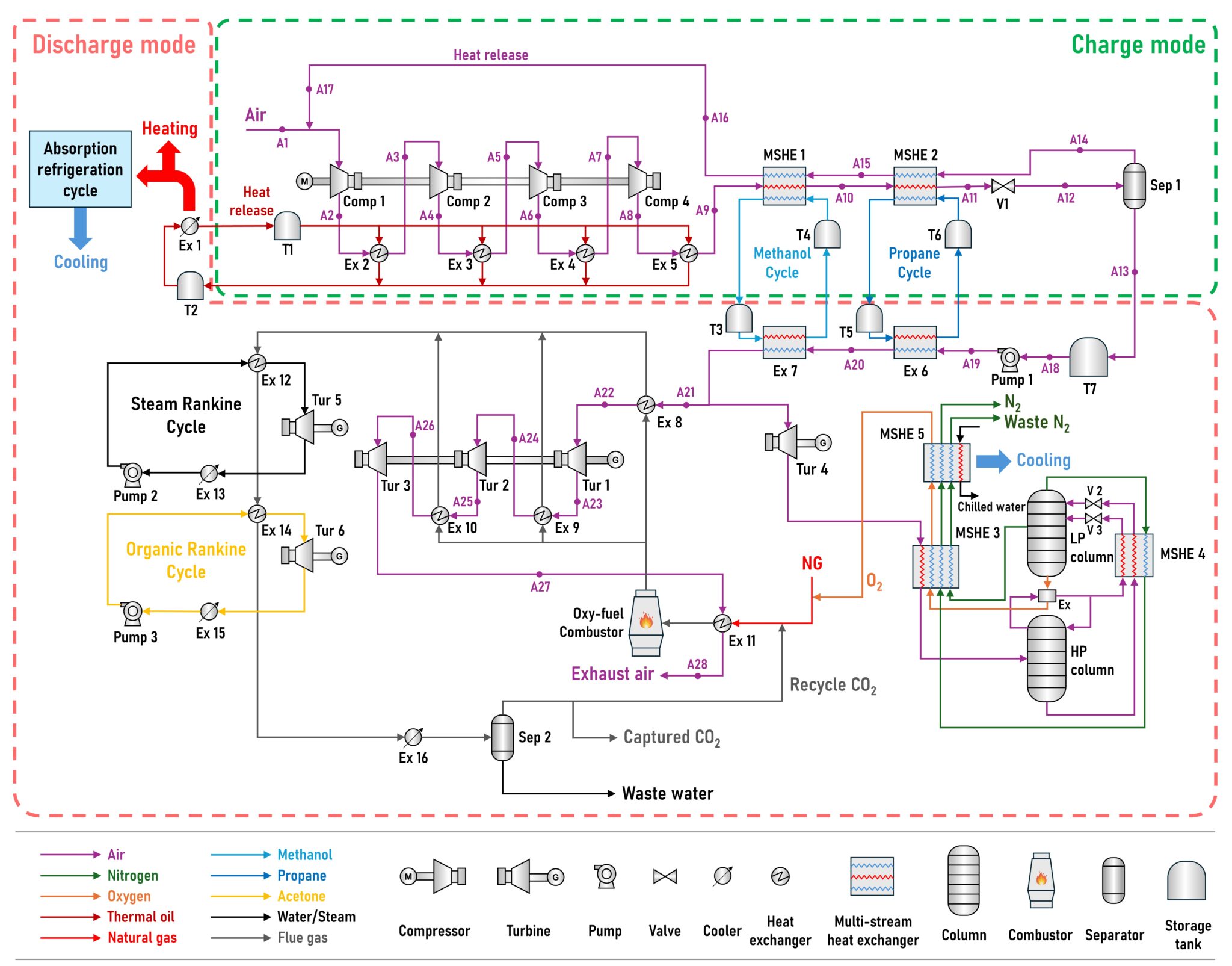 In the paper “Liquid air energy storage system with oxy-fuel combustion for clean energy supply: Comprehensive energy solutions for power, heating, cooling, and carbon capture,” published in Applied Energy, Park and his colleagues explained that the proposed system enhances efficiency by increasing power output through the generation of thermal energy using natural gas as the external fuel during energy release. The oxy-fuel combustion method is employed to generate thermal energy and a cryogenic air separation unit (ASU) separates a part of the stored liquid air into nitrogen and oxygen. The separated oxygen is then used as an oxidizing agent in the combustion reaction. Additionally, economic benefits can be obtained by selling the produced nitrogen as a by-product.