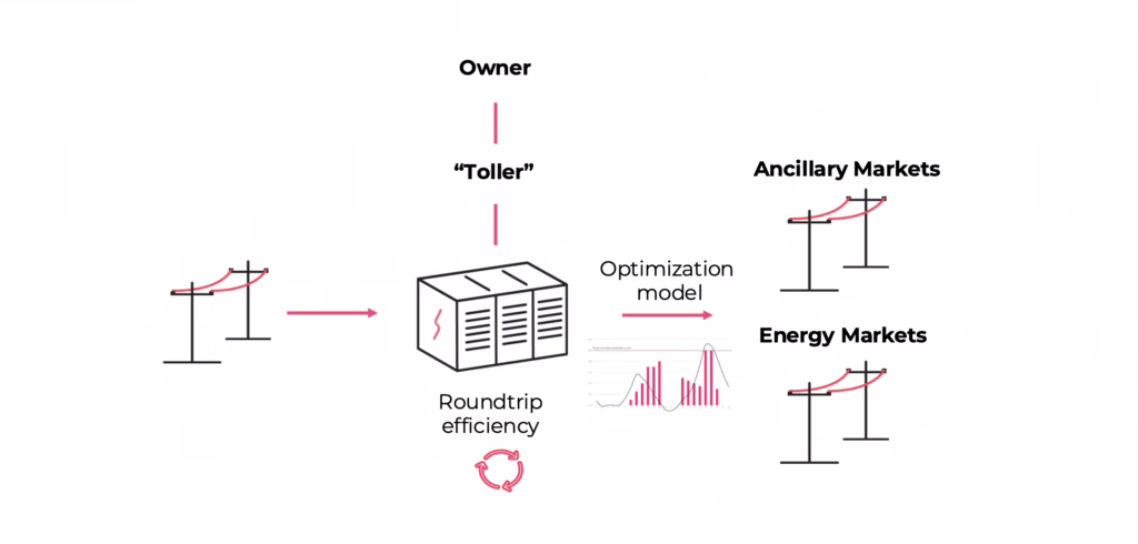 Tolling refers to an agreement whereby the battery project owners contracts the operation of the asset for a set period of time to a third party, namely an optimiser. The optimiser can then utilise the battery asset in both ancillary and arbitrage applications.