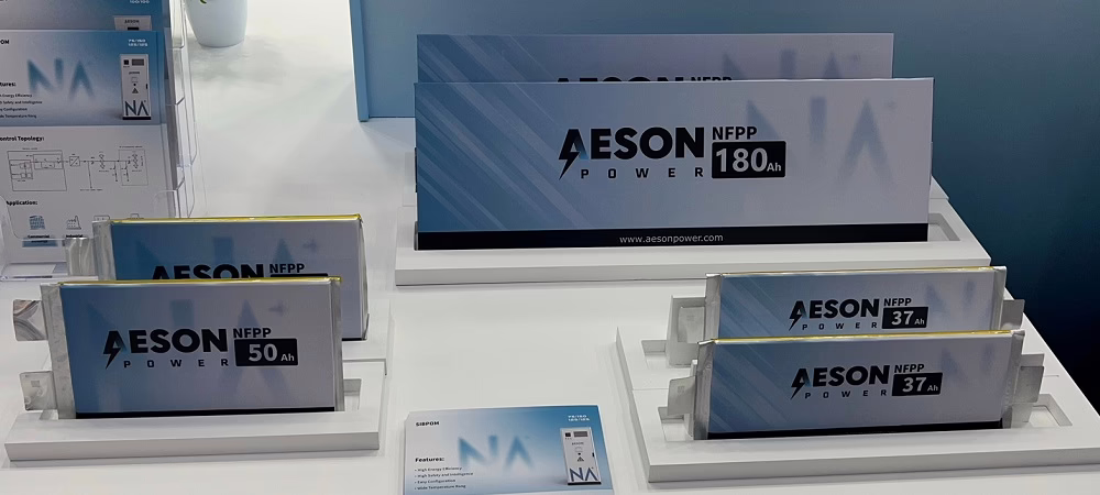 Aeson is deploying sodium batteries in cars and gridsized energy storage solutions. The company displayed its battery cells that are deployed or under development, ranging from 37 Ah to 180 Ah. Speaking with their very optimistic technical sales representative at the booth, the company believes sodium-based batteries – due to their inherently lower costs – could potentially rival lithium ion in the future once the product scales.