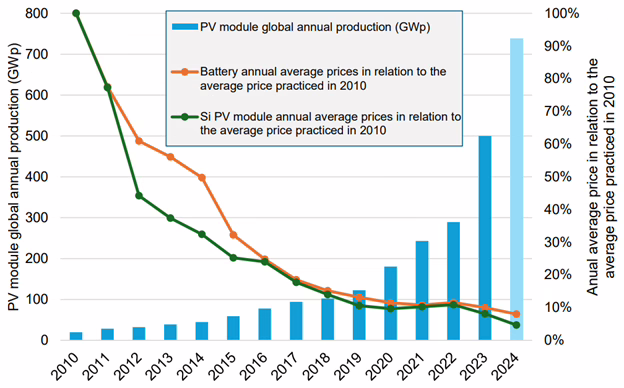 Evolution of the PV module global annual production (in GW, blue bars and left-hand axis), and of the annual average price of PV modules and Li-ion batteries in relation to the average price in 2010 (in %, green and orange points respectively, right axis) (Data from RenewEconomy, BloombergNEF, Fraunhofer ISE, IRENA).