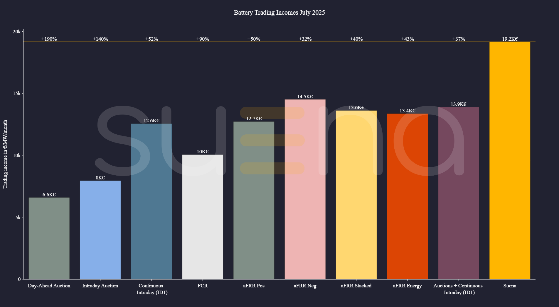 For our July benchmark, we once again modelled a 10 MW/20 MWh standalone BESS, using Suena’s Energy Trading Autopilot. The system was operated with 90% round-trip efficiency, no perfect foresight, and full compliance with market rules across all relevant products: spot markets (day-ahead, intraday auction, and continuous intraday), FCR, and aFRR (including PICASSO energy activation). Average cycling stood at 2.12 per day.