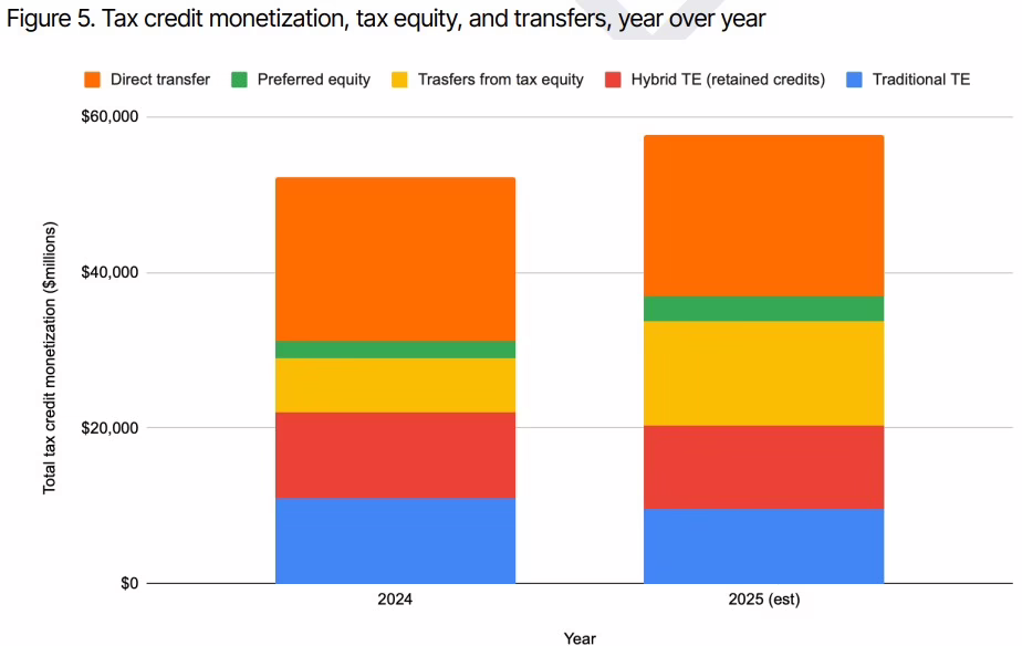 Tax transfers remain the dominant structure in this market. Even among traditional tax equity deals, more than 60% now use hybrid models, where developers retain part of the tax benefits while selling others. Crux says this shift has opened the door to new participants and helped accelerate the move toward storage and other emerging technologies.