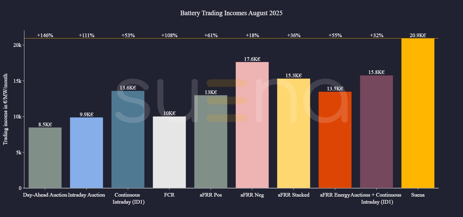 In this slightly more attractive environment, the suena Energy Trading Autopilot achieved a trading revenue of €20.9k per MW, a 9% increase over July, while simultaneously reducing the average number of daily cycles from 2.12 to 1.93. By market standards, this may not sound exceptional. But compared to static strategies, the outperformance was striking: relative to the stacked spot strategy, the Autopilot delivered 32% higher revenues. Against FCR alone, the outperformance reached 108%, and even against aFRR capacity services, gains ranged from 18% to 61%. Compared to single-market optimization, the margin stretched up to even 146%.
