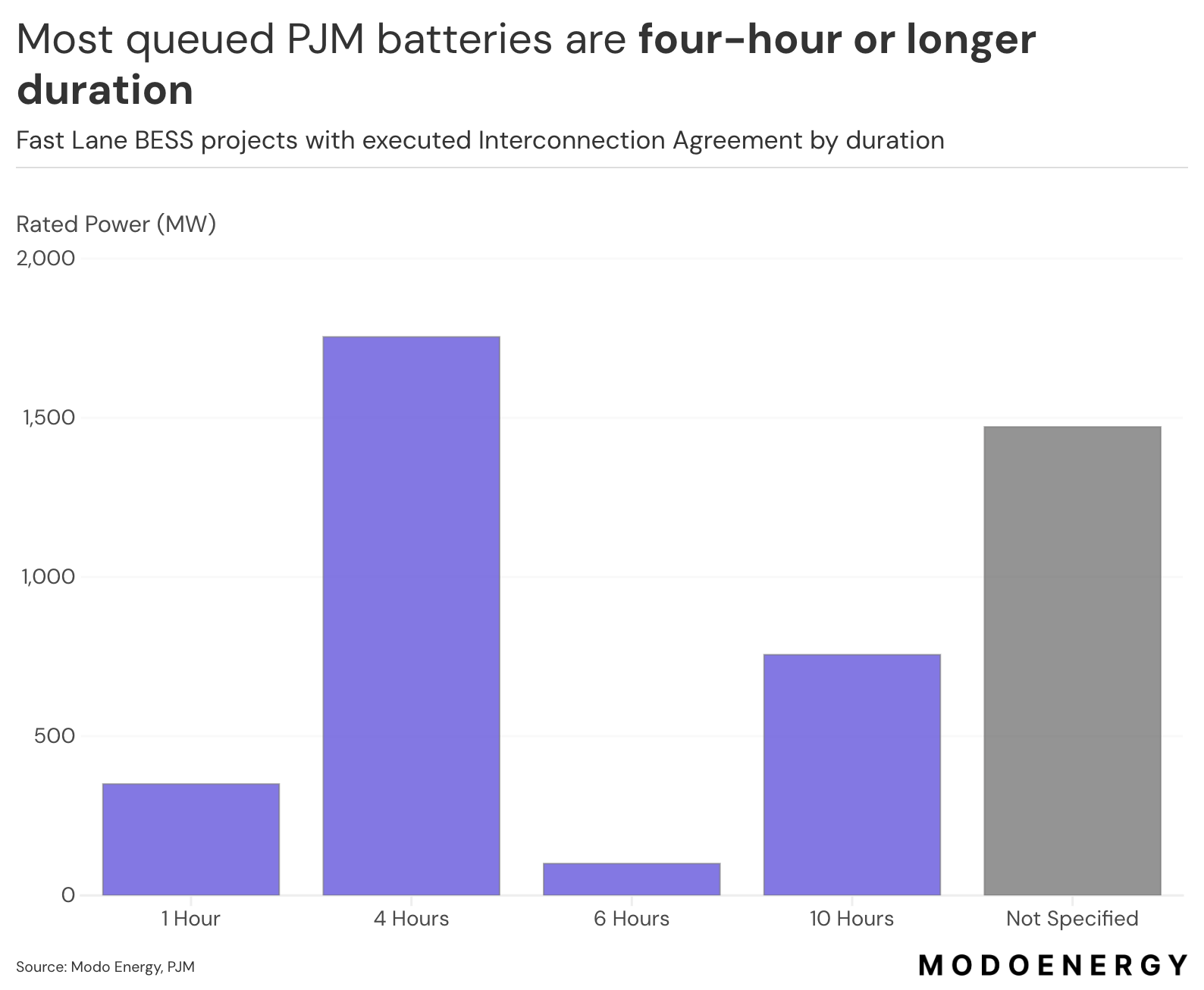 Based on Modo Energy’s analysis of 2025 revenues for currently operating batteries in PJM, clearing in the BRA boosts annual revenues for a 4-hour BESS by around 20-23% compared to a year without a capacity award. Yet in the 2026/27 auction, Anand said, only four batteries cleared, all of which were 4-hour duration batteries that together totaled 35 MW.