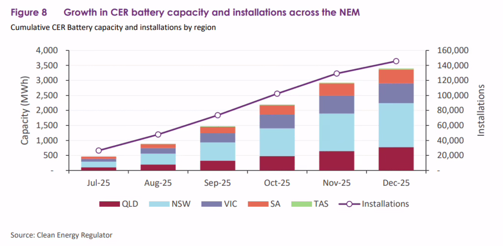 “By the end of 2025, program-installed household battery capacity reached 1,468 MWh in New South Wales (NSW), followed by Queensland (776 MWh), Victoria (659 MWh), South Australia (463 MWh) and Tasmania (32 MWh).”