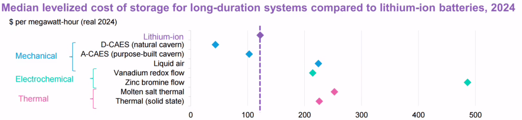 Another interesting chart from the book on page 63 shows the median levelized cost of storage for long-duration systems vs lithium-ion in 2024 terms.